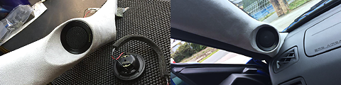 ダッシュボードにツイーターを両面テープで付けるのはいただけません。スマートにインストールさせてください。高音域が断然よくなります。各車種対応。