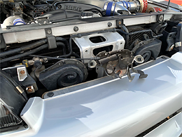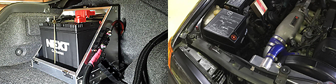 トランク内に専用ケースを設置し、ブローバイパイプも敷きます。重量配分が最適化されるうえ、エンジンルームがスッキリします。R34の寒冷地仕様バッテリーサイズ対応。クランキングが軽々です!